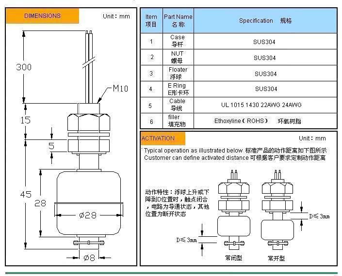 采用進口開關元件,體積輕巧,工作原理簡單,可靠性高,價格便宜,有不同材質及規格的浮球可供選擇,電氣參數可根據客戶要求改變,特殊規格亦可定制。