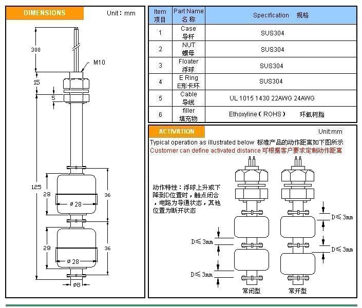 采用進口開關元件,體積輕巧,工作原理簡單,可靠性高,價格便宜,有不同材質及規格的浮球可供選擇,電氣參數可根據客戶要求改變,特殊規格亦可定制。