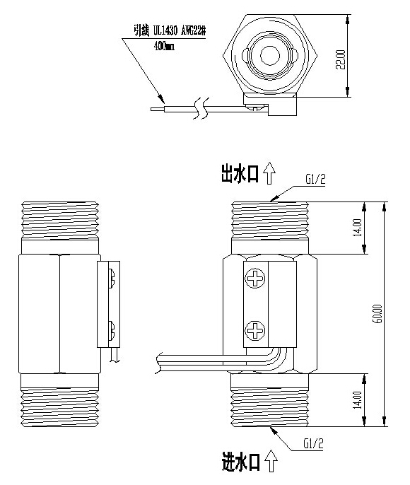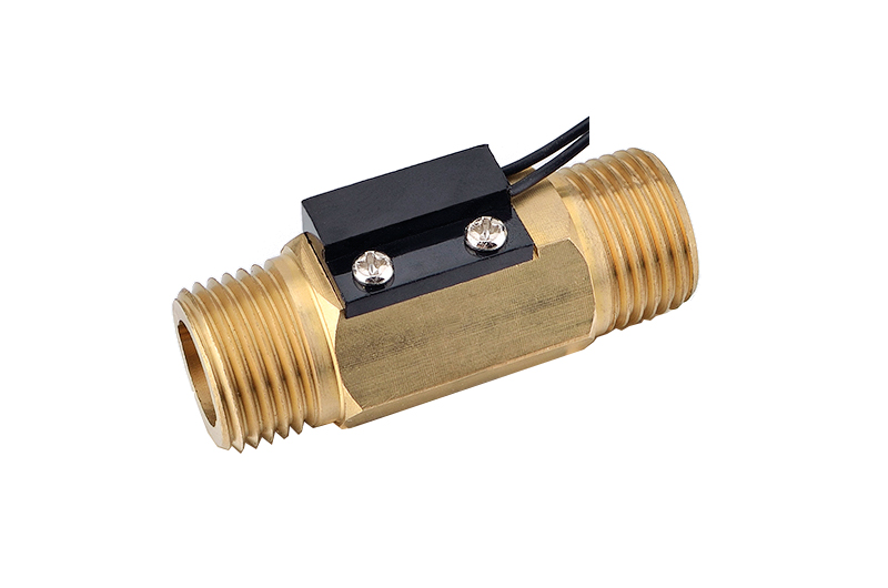 流量開關(guān)由磁芯、黃銅殼體和傳感器組成,磁芯采用鐵氧體永磁材料,傳感器磁控開關(guān)則為進(jìn)口小功率元件。進(jìn)水端和出水端接口均為G1/2標(biāo)準(zhǔn)管螺紋。